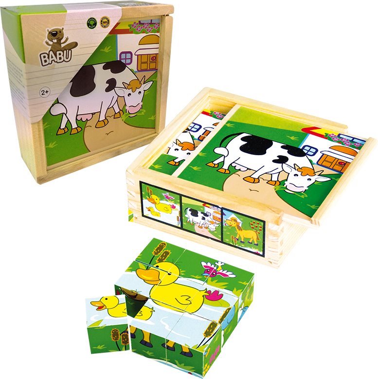 Devět kostek balených v dřevěné krabičce s víkem pro stavění komínů a prvních obrázků s motivem domácích zvířátek.