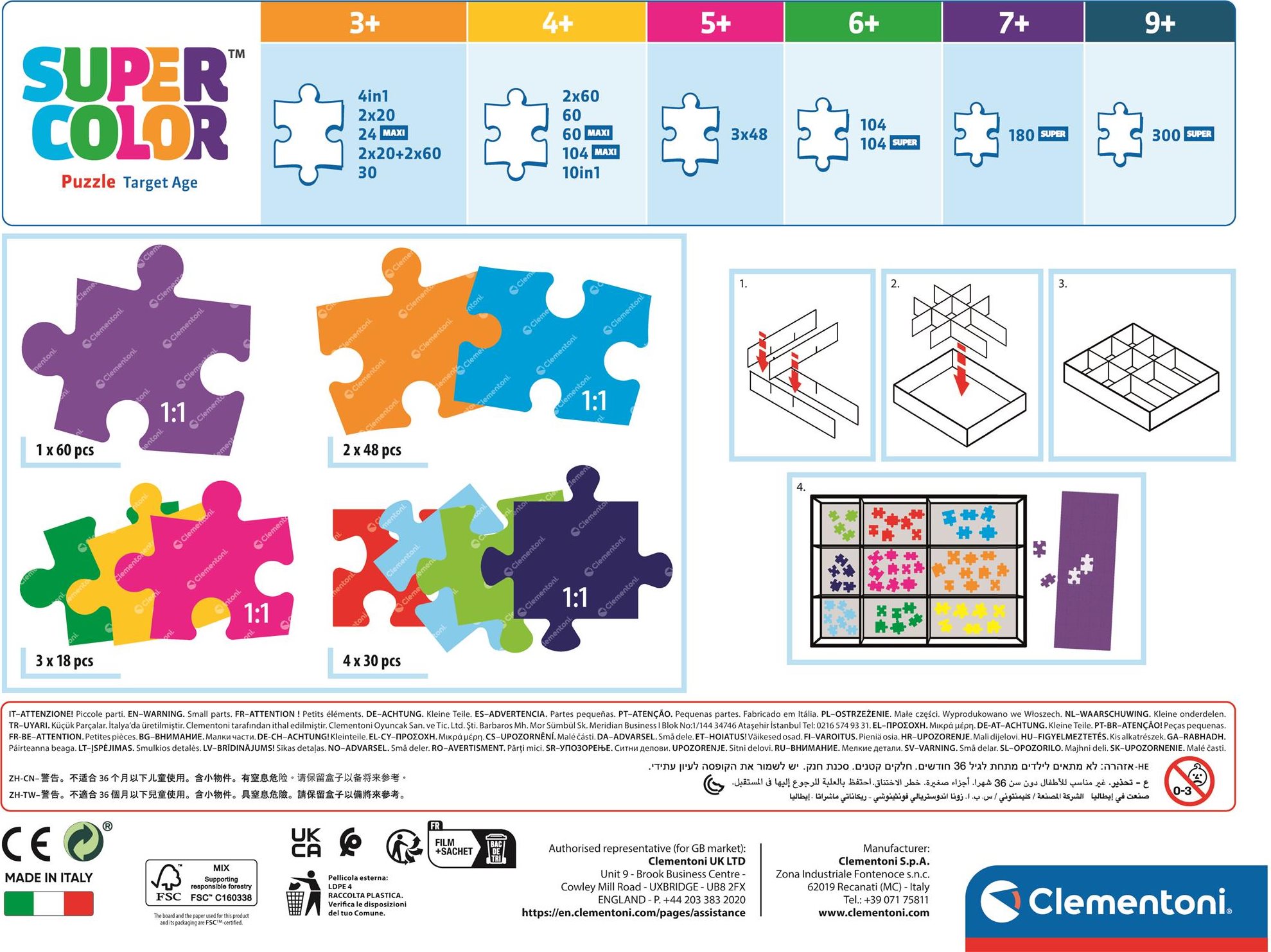 Puzzle Clementoni SuperColor vynikají exkluzivní technikou tisku, která zaručuje trvale krásné a zářivé barvy. Každý obrázek je vytištěn na pevný karton s dokonale padnoucími dílky, které se snadno spojují a dobře drží.