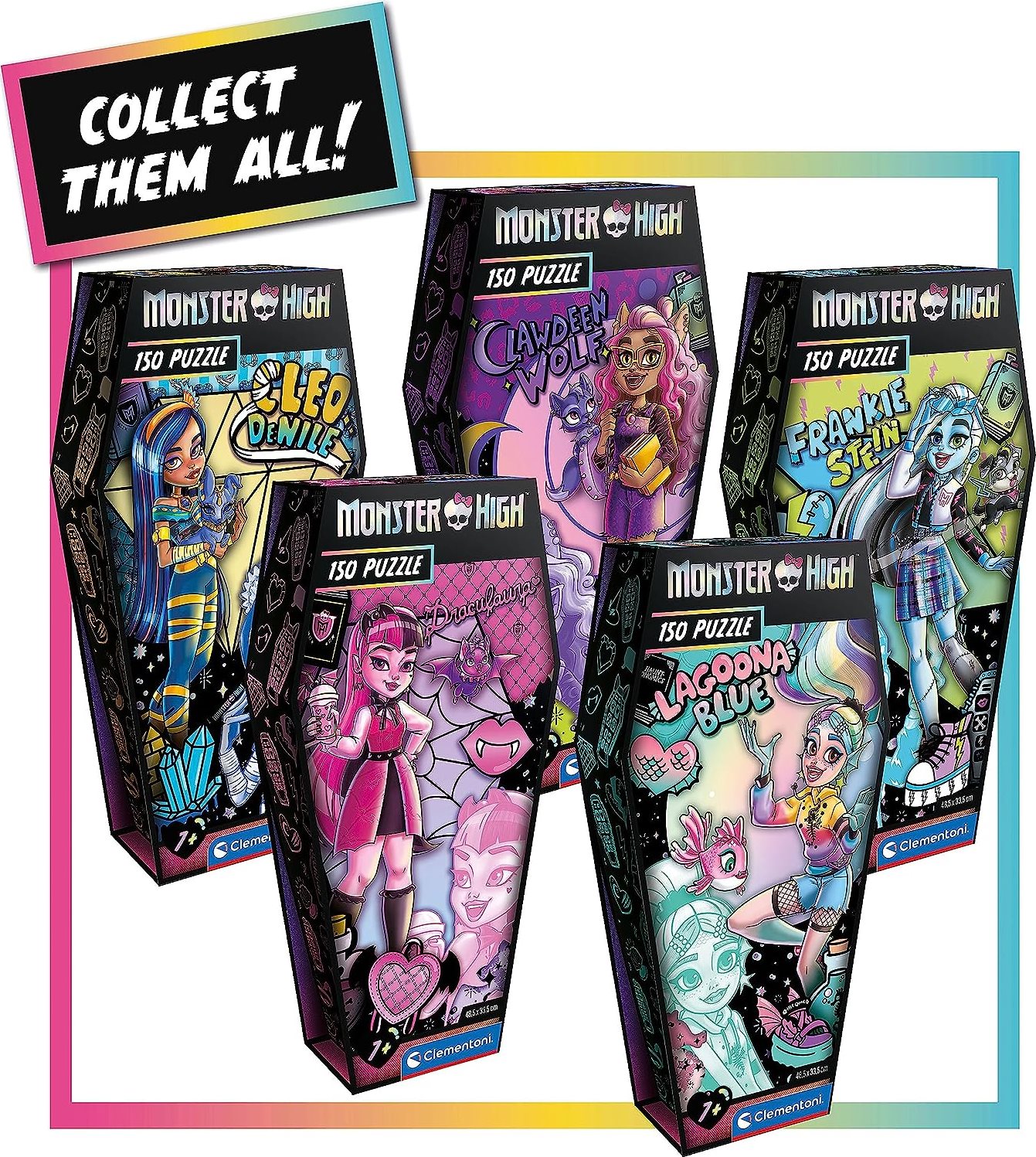 Puzzle s hlavními postavami seriálu Monster High v originální krabičce ve tvaru rakvičky.