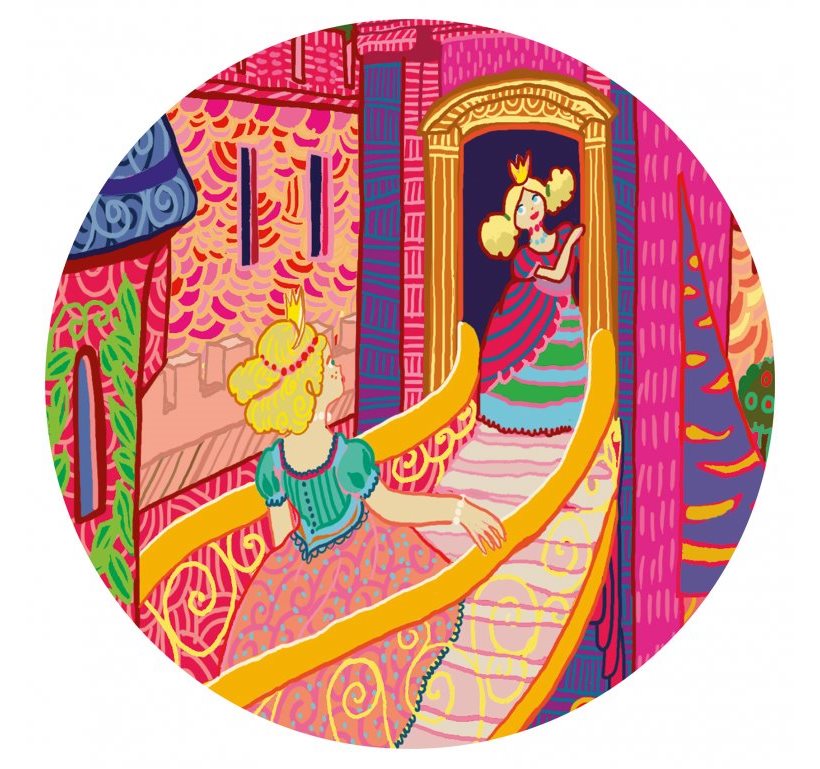 Čtvercové puzzle s motivem pohádkového zámku s vílami a princeznami je baleno v zajímavé krabičce.