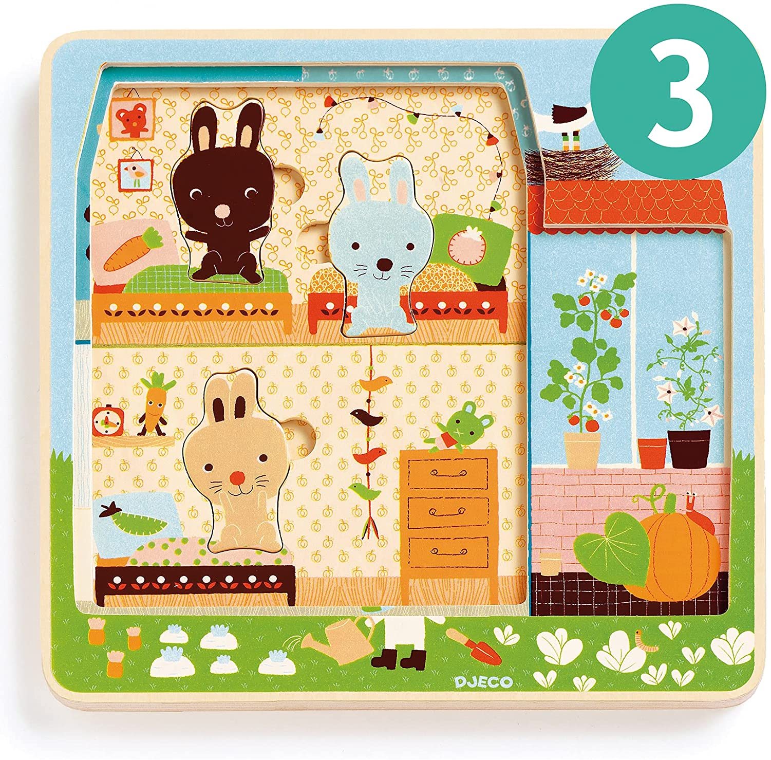 DJECO Vícevrstvé dřevěné puzzle Králičí domeček U Mrkvičky 12 dílků