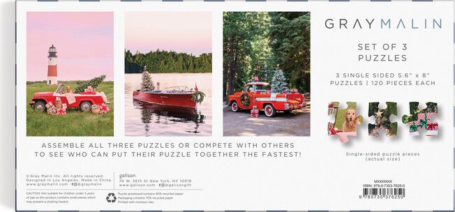 Gray Malin The Holiday 3-In-1 Puzzle Set od Galisonu obsahuje tři 120dílné puzzle se třemi Grayovými nejprodávanějšími leteckými snímky. Puzzle Gray Malin jsou ideálním dárkem pro milovníky puzzle i výtvarné fotografie.