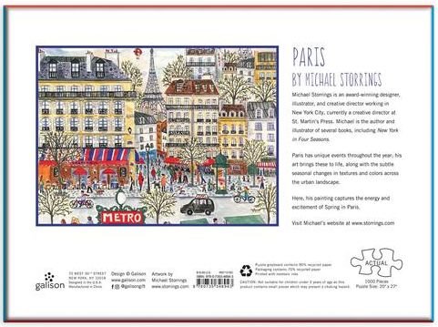 Puzzle od anglického výrobce Galison s motivem francouzského hlavního města od známého malíře Michaela Storringse. Balení obsahuje informační přílohu o interpretovi a obrázku v anglickém jazyce.