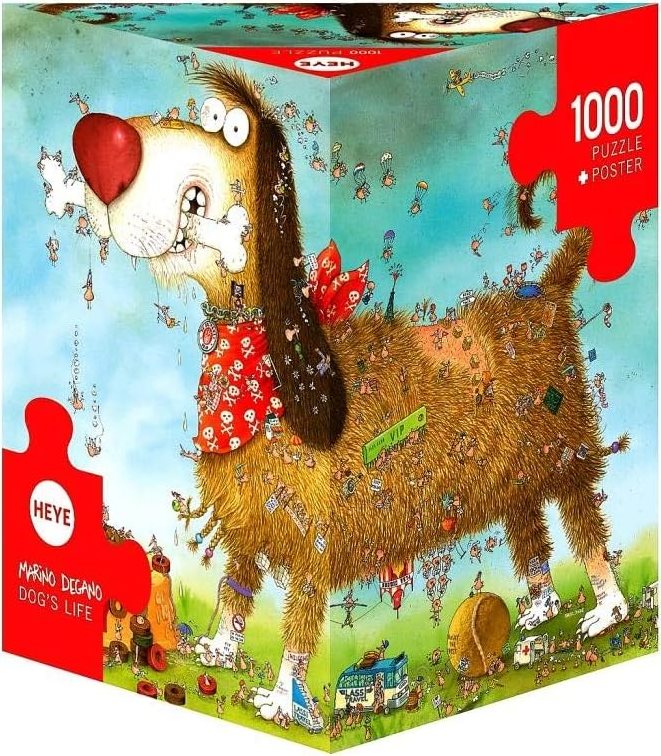 Puzzle od karikaturisty Marina Degana balené v netradiční trojboké krabici, která obsahuje plakát jako předlohu pro skládání.