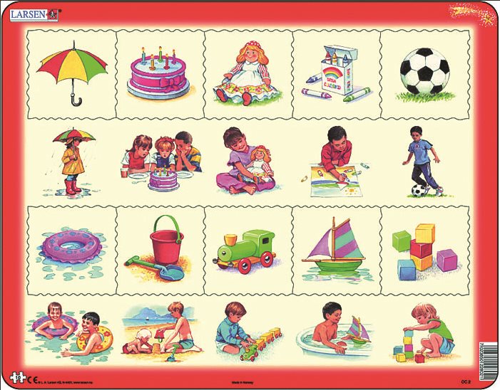 Výukové puzzle, které znázorňuje děti při různých činnostech. Ke každému z obrázků patří dílek, který s obrázkem nějak souvisí. Dílky mají rozdílný tvar a celé dětské puzzle lze složit, jen když jsou všechny obrázky umístěny správně.