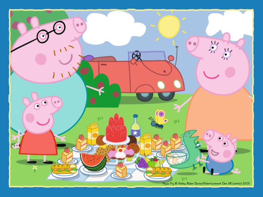 Čtyři puzzle s různou obtížností od 12 do 24 dílků s prasátkem Pepinou a jeho rodinou.