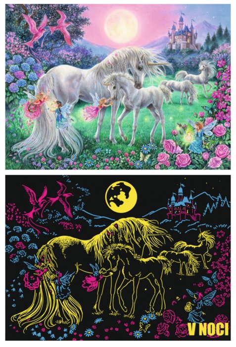 Neonové - fluorescenční puzzle s motivem jednorožců svítící barevně ve tmě ze série COLOR STAR LINE. Puzzle má speciální potisk, který po nasvícení ve tmě svítí.