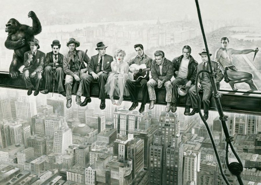 Parodie fotografie Čas oběda, rok 1932 od Renata Casara se známými a slavnými osobnostmi. Jejich jména jsou uvedena na zadní straně krabičky od puzzle. Zleva: King Kong, Clark Gable, Charlie Chaplin, James…