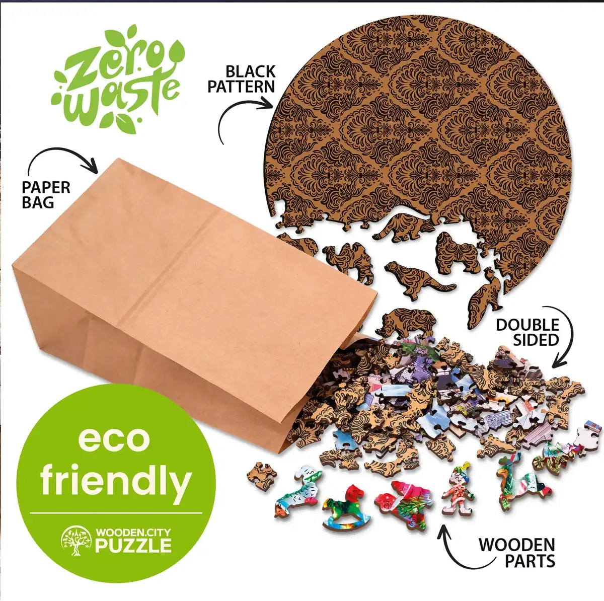 Laserem řezané puzzle Wooden City - kousek dřeva, hodiny zábavy Neobyčejné puzzle pro všechny, kdo hledají víc než jen obrázek. Každý motiv ukrývá speciálně tematicky tvarované dílky ve tvaru zvířat, budov či předmětů s vypalovanými detaily.